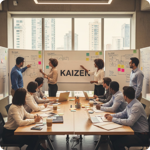 O Kaizen promove avanços diários e estruturados, eliminando desperdícios, simplificando atividades e tornando o fluxo de trabalho mais eficiente. Com isso, a empresa evolui constantemente sem depender de grandes investimentos.